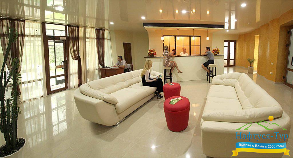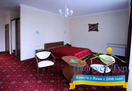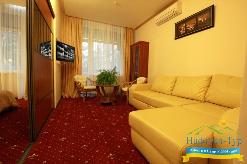 Проживание организовано в комфортных номерах различной категории: от стандартных до люксовых. Каждый номер оборудован всем необходимым для удобства гостей: мягкая мебель, телевизор, кондиционер, санузел. Для отдыхающих предусмотрено трехразовое диетическое питание, которое может быть скорректировано в зависимости от лечебных рекомендаций.
