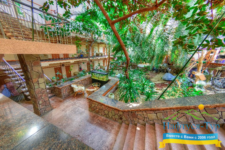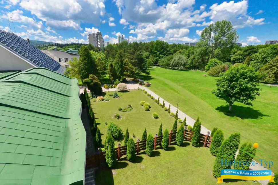 Санаторий находится в шаговой доступности от курортного парка Трускавца — идеального места для прогулок на свежем воздухе. Чистый горный воздух Карпат, тишина и живописные пейзажи способствуют полноценному восстановлению организма. Для активных гостей доступны спортивные площадки и тренажерные залы.
